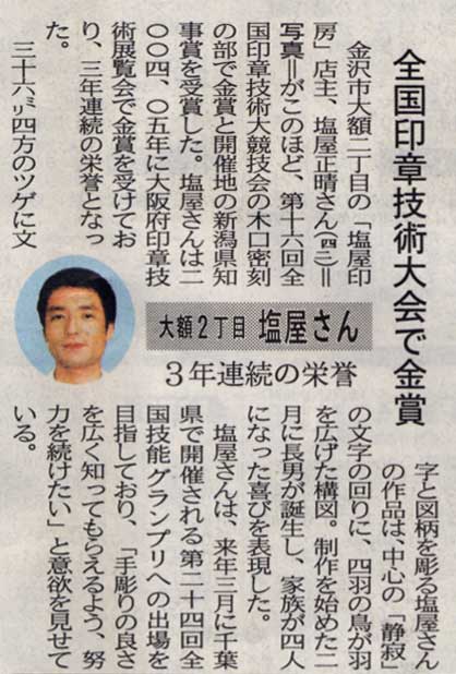 はじめまして、金沢でハンコ屋を営んでいる塩屋正晴といいます。